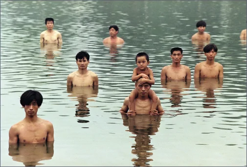 This Zhang Huan document of a performance features a portion of a group of forty migrant workers from Beijing standing in a fishpond. In this piece, Zhang has invited fishermen, laborers, and construction workers to wade into a fishpond in order to raise the water level by a meter, representing migrant displacement and population elevation in Beijing. Zhang is renowned for his use of body, often masochistically, in ritualistic performance art pieces and sculptures alike. Present in his work is his Buddhist upbringing, from which he derives his conceptions of interconnectedness, suffering, and bodily pain.