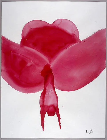 Completed just three years before her death at the age of 98, “The Birth” seems to exhibit mortality salience — an awareness of the inevitability of death and continuation of life cycles throughout time. What initially appears to be a tulip, is upon further inspection a moment of emergence: childbirth. The drawing suggests transformation from embryo, to child, to woman, to mother, and a return to embryo. The gouache reads like a bloodstain on paper and carries with it a sense of liquidity that is characteristic of the medium and the female body. The absorption of bloody gouache into paper also resembles the relationship between the body of the mother and child. In this painting, perspective is intentionally ambiguous; the viewer is positioned either underneath the mother (between her legs) or standing before her.